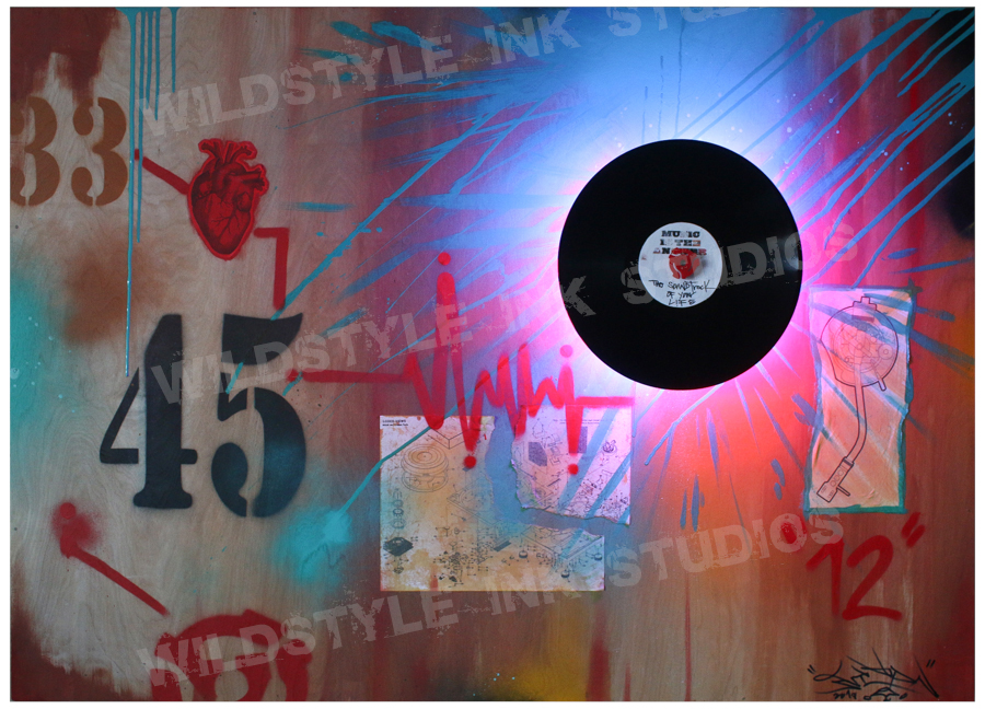 Music is the Answer – 36×48 Spray paint, Mixed media, Vinyl, LED backlighting on Wood Panel (2018)